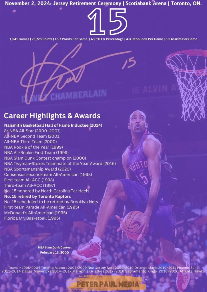 TORONTO [Peter Paul Media] — Vince Carter will be honoured Saturday night for his mark on Canadian basketball when his jersey is raised to the rafters, the first Raptors player to have his number retired. Below is a brief look at his illustrious career: